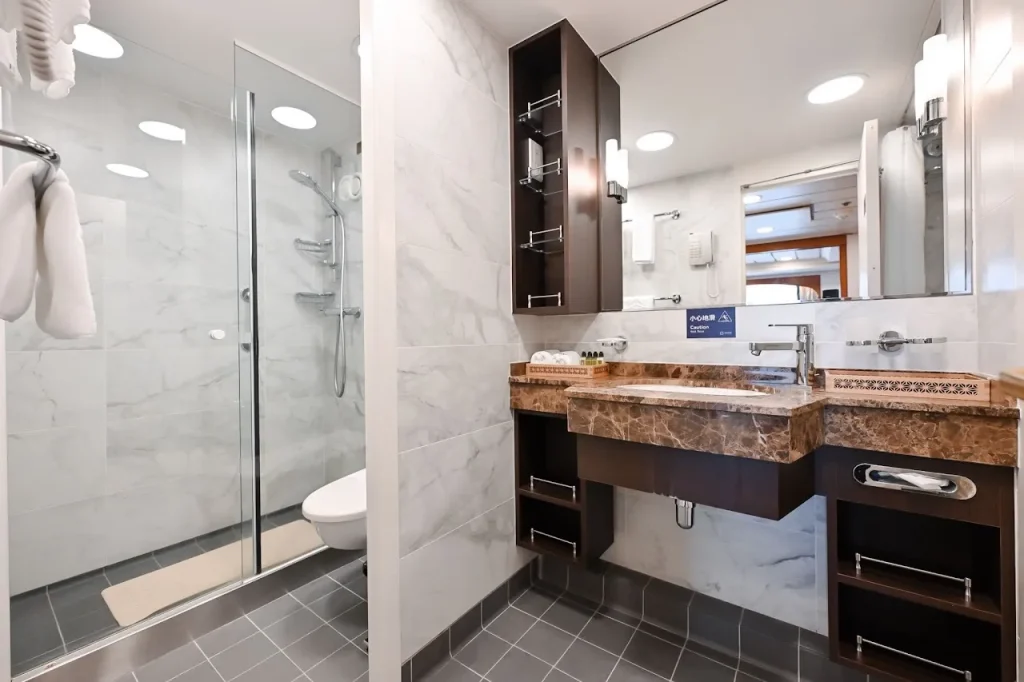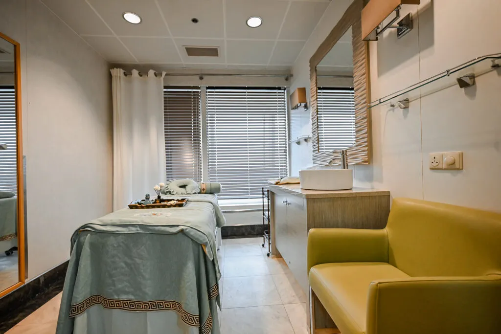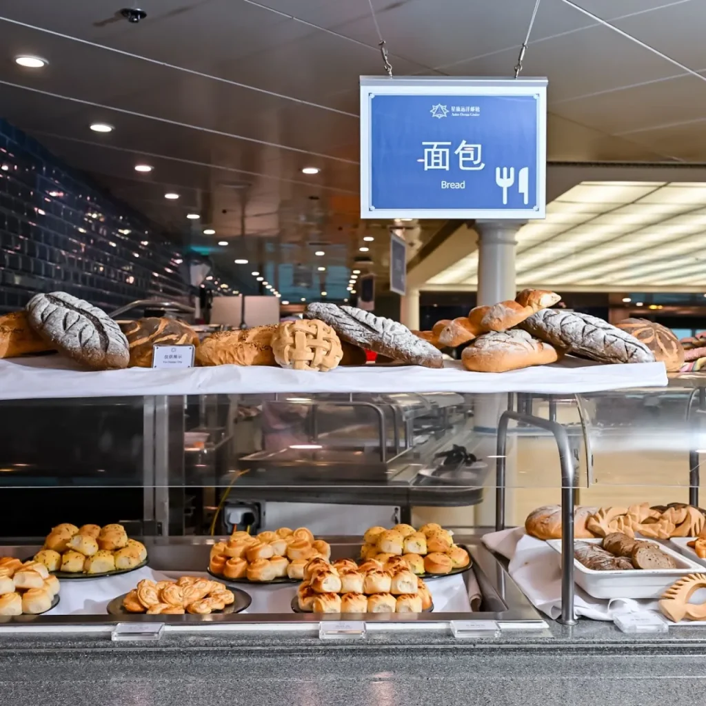 Think buffet spreads, duty-free shopping, movie nights, a swimming pool, full-on spa, gym, library, and even a dedicated mahjong room.